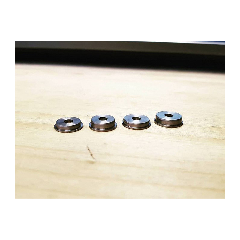 Kluzná ložiska o průměru 9mm (9,02mm) vyrobená přesným CNC soustružením, z vysoce jakostní oceli 90MnCrV8, tepelně zušlechtěná (kalená) na tvrdost 58 - 60HRC a popuštěná proti odstranění pnutí. Vysocejakostní ocel spolu s výslednou tvrdostí předurčuje použití ložisek na nejsilnějších pružinách při zachování dlouhé životnosti. Osičky ozubených kol je nutné dostatečně mazat vazelínou proti zadření a snížení tření.