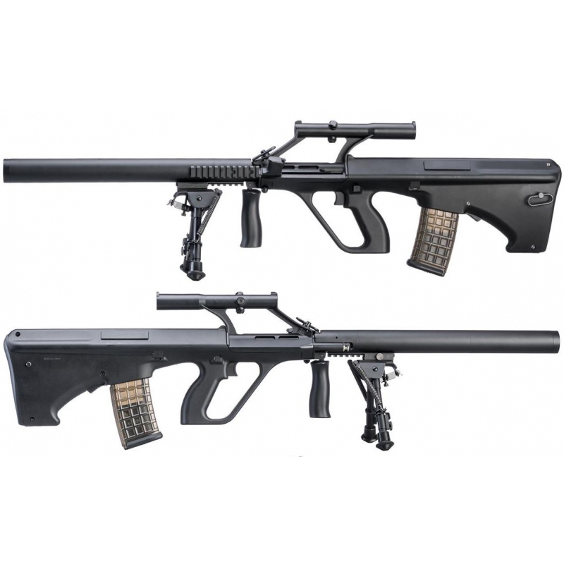 Balení obsahuje dvojnožku, optiku, tlumič a zásobník