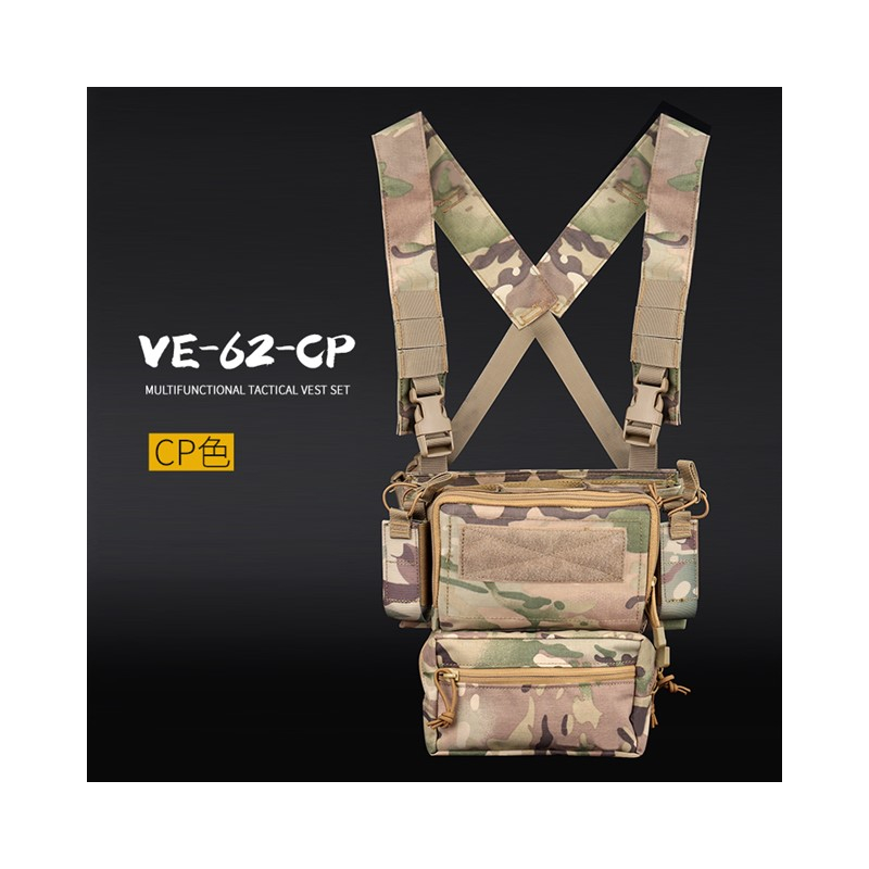 Taktický chest rig pro airsoft s nízkým profilem a velkými kapsami. Z horní části lze vložit insert na tři větší zásobníky, po stranách se pak nacházejí dvě menší sumky na pistolové zásobníky, které na místě drží stahovací šňůrka. Hlavní hrudní kapsa na zip je uvnitř dostatečně prostorná, díky dvěma elastickým popruhům a velcro panelu si v ní uvnitř udržíš pořádek.