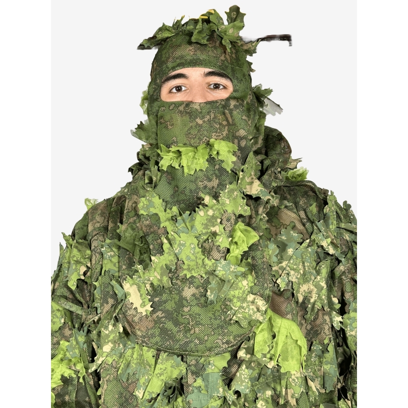 KMCS Balaclava s náhodně rozmístěnými realistickými 3D listy perfektně skryje každý obličej, navíc s prodlouženým vousem vyniká efektem snížení stínů, které uživatele často prozradí zkušenějším pozorovatelům. Prodloužené vousy stahají až po hrudník, takže neodhalí krk ani siluetu postavy. Temeno hlavy je porostlé 3D listy pro napodobení větve či pařezu v lese.