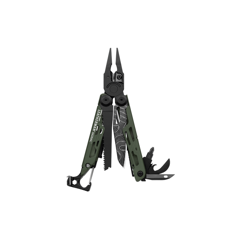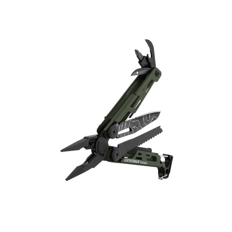 Leatherman SIGNAL® je přenosný sen každého Preppera s 19 nástroji pro nouzové situace (křesadlo s diamantovým škrtátkem, signální píšťalka, nůž s kombinovanou čepelí, kladivo, šídlo, sada otvíráků a šroubováků a multifunkční kleště.)