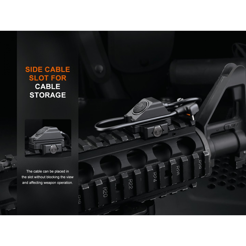 Taktický kabelový spínač AER-06S pro svítilnu Fenix GL19R pro použití se svítilnou montovanou na dlouhé zbrani. Kabel se se svítilnou propojí prostřednictvím USB-C portu. Na druhém konci kabelu je umístěné bezhlučné tlačítko.