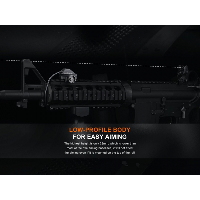 Taktický kabelový spínač AER-06S pro svítilnu Fenix GL19R pro použití se svítilnou montovanou na dlouhé zbrani. Kabel se se svítilnou propojí prostřednictvím USB-C portu. Na druhém konci kabelu je umístěné bezhlučné tlačítko. Spínač lze díky přiloženému příslušenství umístit na zbraňovou lištu Picatinny MIL-STD-1913 i rozhraní M-LOK.