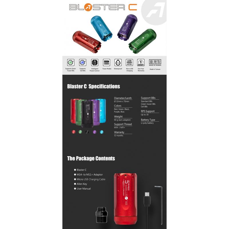 Chcete, aby vaše airsoftová zbraň střílela se skutečným výšlehem plamenu jako reálné zbraně, abyste za šera a v tmavých CQB arénách dobře viděli své zásahy? Nebo zkrátka chcete střílet jako blaster ze Star Wars? Potom je nasvětlovací tlumič AceTech BLASTER C vaším splněním přání. Tento tlumič totiž spojuje nasvětlování Tracer kuliček s realistickou imitací výšlehu plamene. Díky 3 výkonným LED diodám umístěným na ústí tlumiče si užijete efekt plamene při každém výstřelu. Nejvíce vynikne u plynových zbraní, ale skvěle funguje i na AEG. Tlumič je navíc odolný proti prachu a stékající vodě (IP65), takže je ideální i pro venkovní hry. Vestavěná Li-Ion baterie zajistí nasvícení až 24 000 kuliček a po 5 minutách nečinnosti se zařízení samo přepne do úsporného režimu. O nabíjení se postará USB-C konektor a tlumič je plně nabitý po 2,5 hodinách (nabíjecí USB-C kabel je součástí balení). Na tlumiči se nachází závit 14 mm CCW (levotočivý) a součástí je redukce na pravotočivý 11mm CW závit, který je běžný u airsoftových pistolí.