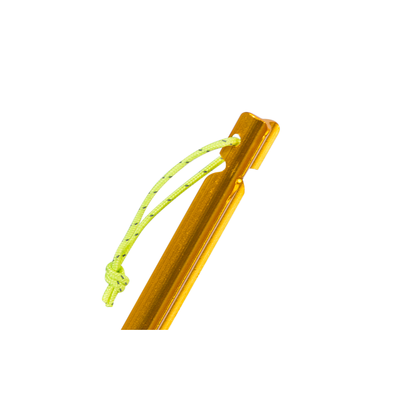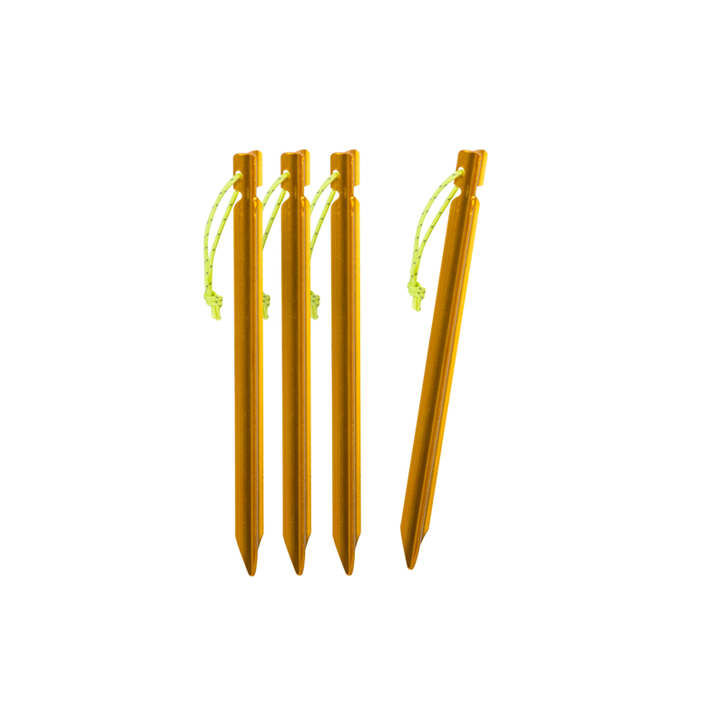 Sada čtyř lehkých kolíků vyrobených z hliníku je navržena tak, aby poskytovala maximální odolnost a snadné použití. Kolíky jsou tvarovány do šípovitého profilu, což jim dodává vyšší stabilitu. Každý kolík váží pouhých 12 gramů. Šňůrky připevněné ke každému kolíku usnadňují jejich vytahování z půdy.