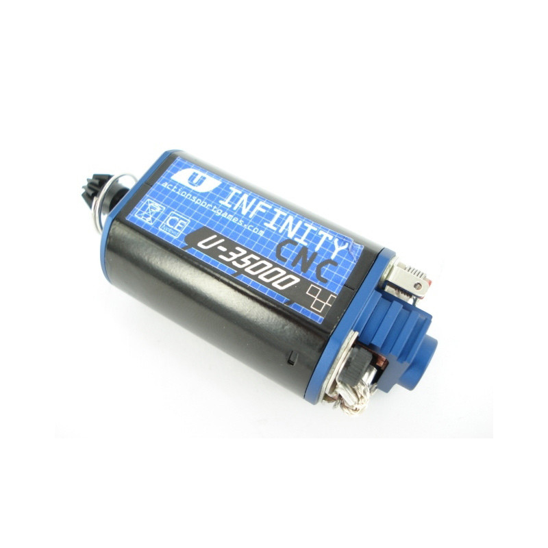 The INFINITY CNC motor is designed for maximum torque and reliable performance across spring tensions. It features a CNC-machined aluminum cap, stainless steel shaft, steel pinion gear, and a high-performance rotor with heat-resistant magnets. Thanks to carbon brushes and silver-plated wiring, it delivers excellent efficiency even under long-term use.