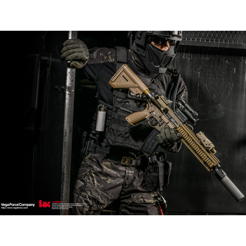 The AEG version offers top-of-the-line technology and craftsmanship. The assault rifle features ambidextrous controls, perfect alignment of the weapon's body, massive handguard, and Heckler & Koch markings, including details. The body is of premium quality and with a surface finish mimicking the matte finish of real firearms, all topped with a modernized HK416 Slimline stock. Thanks to the classic 14mm CCW thread, you can easily equip your HK416 with a suppressor, we recommend the AngryGun SOCOM QD suppressor for the proper Seal Team Look! Inside this beauty, you'll find a reinforced V2 Avalon gearbox (specifically, a modernized VFC V2.1 ECS composition with QSC quick spring change system), premium VFC internal parts, and an integrated MOSFET, use only with a Li-Ion or Li-Po batteries 7.4V type Buffer (Stick) located in the stock tube. Rotary polymer Hop-Up chamber in ProWin style and above all, precision 6.03 mm barrel will ensure accuracy.