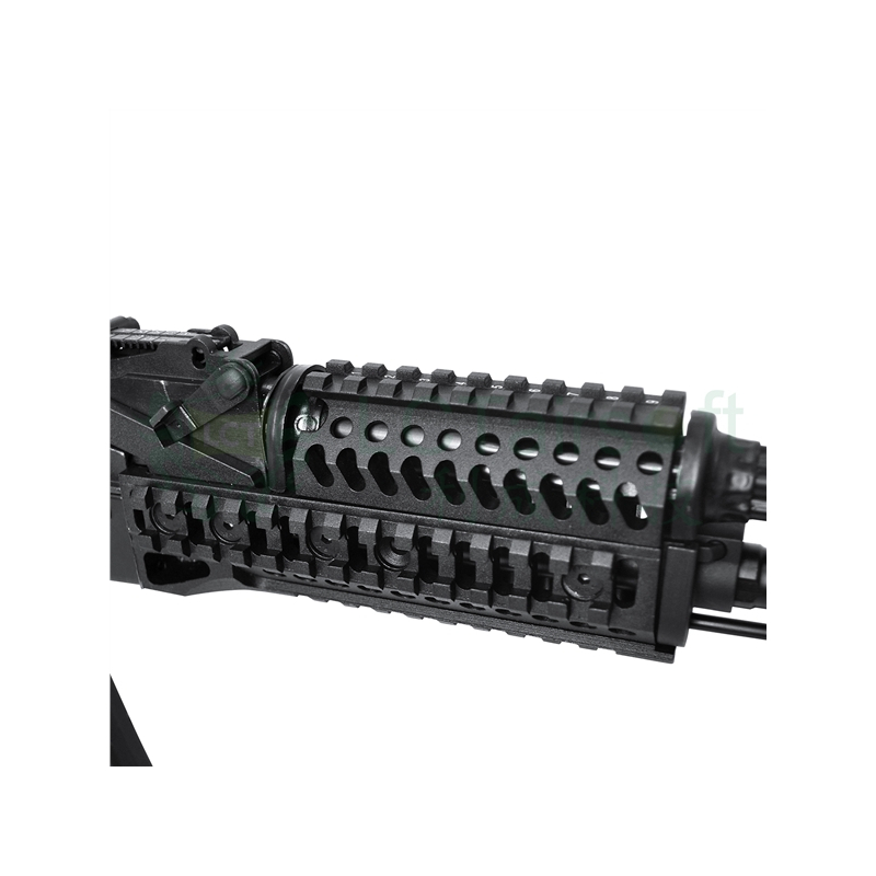 The ZK 104 is a beautiful replica of the standard Russian AK-104 assault rifle, sitting in a modern jacket. The body and controls are made of steel, the stock is made of aluminum. On the weapon we find accessories of the Zenitko copy. The stock is adjustable with a cheekpiece. On the left side of the rifle there is a side bar on which you can place a rifle scope or a collimator. The weapon looks solid and is indistinguishable from the originals. In the package, a pressure magazine.
