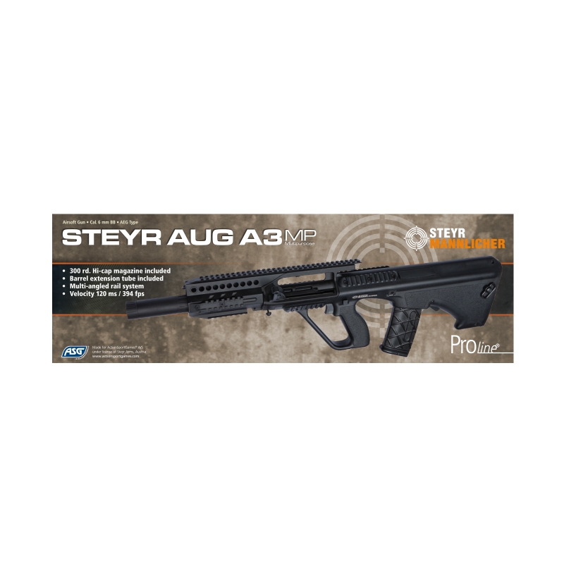 AEG replica of the assault rifle STEYR AUG with the model designation A3 MP (ASG Pro-line) in a black finish.