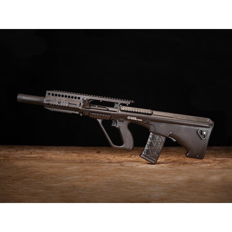 The external construction of the ASG Steyr AUG is designed with a focus on durability and stability, with a unique serial number for each model. The body of the gun is made from durable fiber-reinforced nylon, ensuring high quality and resistance to wear.