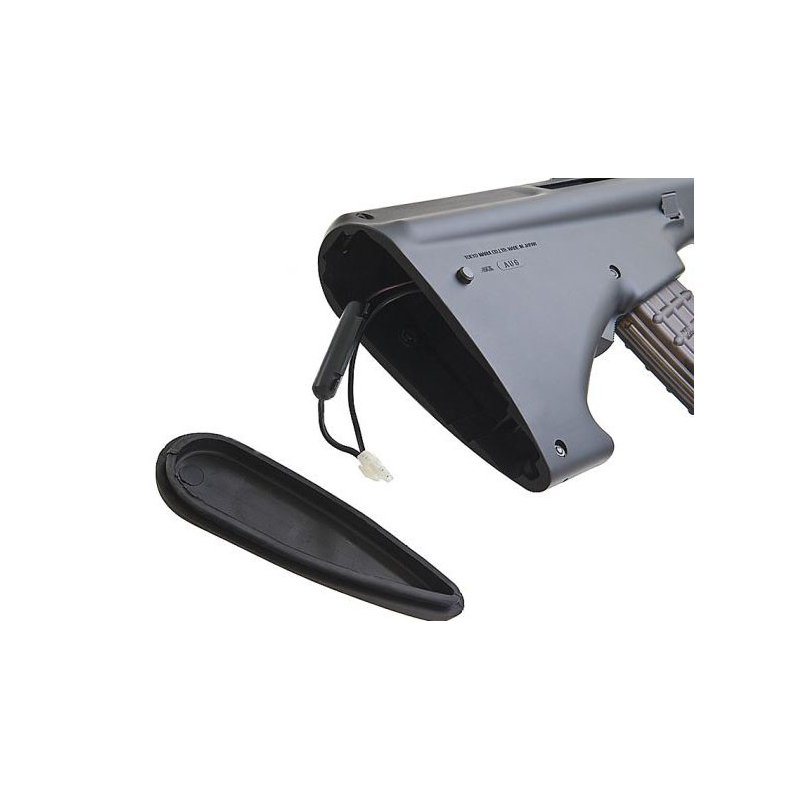 TM Steyr AUG High Cycle RIS is an airsoft replica of an AEG (electrically powered by batteries), the heart of which is a gearbox, which is a metal housing for additional internal parts responsible for the firing (power) of the weapon. It consists of a set of metal gears that drive an AEG motor. The gears push the piston against the spring, and upon its release, the piston head compresses the air into the nozzle until it stops at the impact surface of the cylinder head. The nozzle then sends the BB through the hop-up chamber into the barrel and the air provides the necessary muzzle velocity.