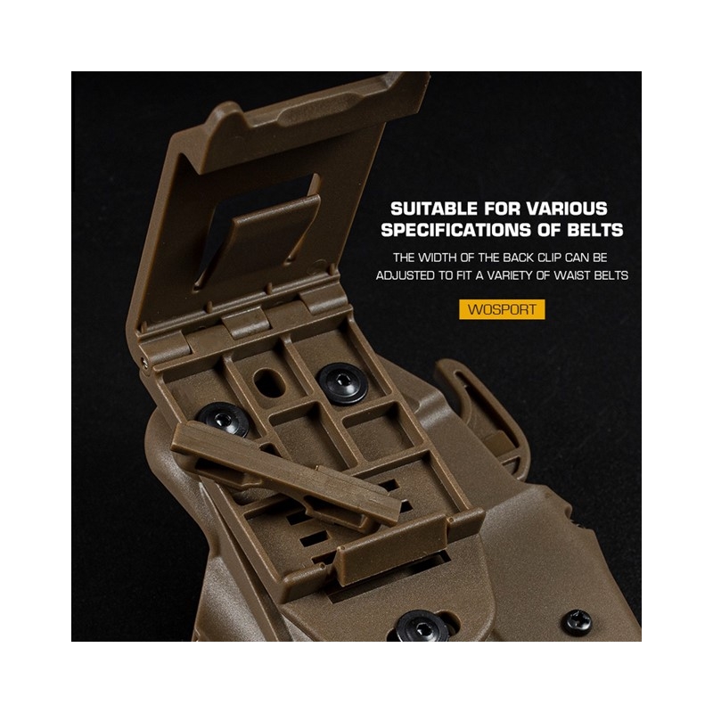 Adjustable holster for most Full Size pistols, including G-series (17, 18C), P 226, M 92, as well as Hi-Capa and CZ 75.