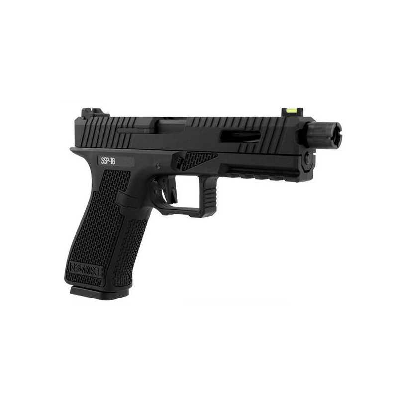Can’t decide which Glock-style pistol to get? Looking for a powerful gas pistol with high rate of fire and excellent reliability? Want a unique design that stands out from the crowd? Then you’ve found your new favorite sidearm – the SSP18. This gas blowback pistol fires in both semi and full-auto modes with an impressive rate of fire of up to 17 RPS. Built on the G-Series 18C (Glock 18C) platform, it delivers outstanding accuracy thanks to the fixed FXB outer barrel and the 6.01 mm precision inner barrel. The CNC-machined hop-up chamber provides consistent spin even with heavy 0.32 g BBs. The SSP18 is designed for players who demand accuracy, rate of fire, and durability in one package. It features steel trigger group components built to handle both CO2 and HPA setups (at 1 Joule output), ensuring long-term reliability. The frame is made from high-quality polymer and paired with a CNC aluminum slide. Thanks to its 14 mm CCW threaded barrel, the pistol can be equipped with a tracer unit or suppressor. A RIS rail is located under the barrel for accessories, and the pistol fits all standard Glock holsters (G17 size). With the optional carbine kit, you can even turn your SSP18 into a compact SMG.