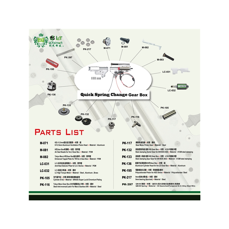 The Taiwanese company LCT produces some of the most realistic replicas and weapons on the market. It focuses on AK, AR, HK platforms. Their bodies are made of steel and copy the production processes of sharp originals. LCT replicas are known for high reliability, long life and attention to detail. The assortment also includes spare parts and a wide range of quality accessories.