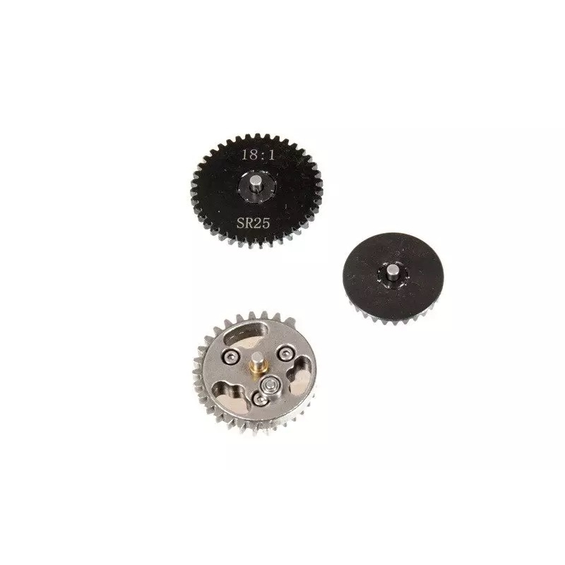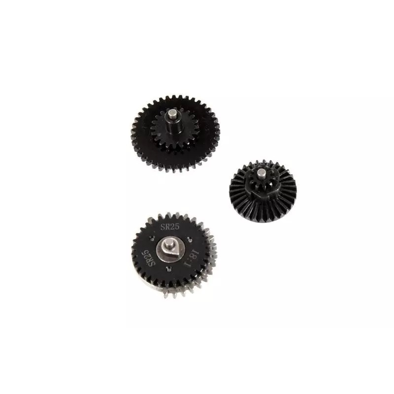 A set of gears made of steel using precision CNC machines. Ideal for tuning airsoft replicas.