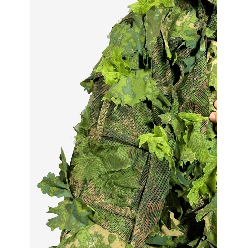 The entire KMCS concealment system is designed for one purpose: flawless camouflage. This garment features carefully selected colors that blend seamlessly with natural environments. The 3D leaf configuration mimics the intricate patterns of a forest floor. Additionally, it offers the option to attach real vegetation or artificial materials for enhanced concealment. The oversized hood allows for helmet use or can act as additional cover for a riflescope while aiming.