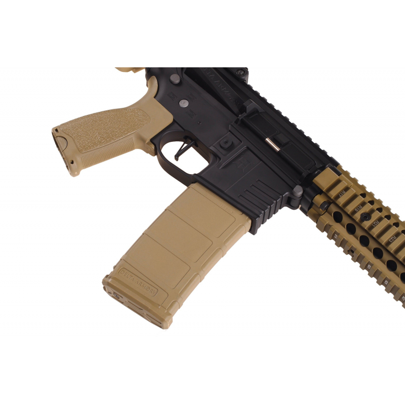 Delta Armory DMAG Mid-Cap Magazine for 120 BBs for AEG / HPA M4 (and similar models) in tan. Fits most guns on the market (Specna Arms, CYMA, E&C, etc.) Thanks to the strong spring, it handles heavier ammo and higher rates of fire. It mimics the design of PMAG with a durable polymer body. Fits standard AR15 and 5.56 pouches.