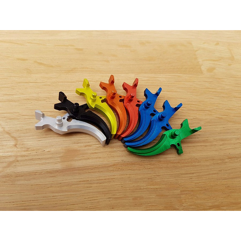 CNC trigger made of very strong aluminum EN AW 2007. It is designed for airsoft guns of M4 type and its clones. Trigger's response is very quick. Overall speed up is approximately 70%. Trigger's surface is decoratively anodized.