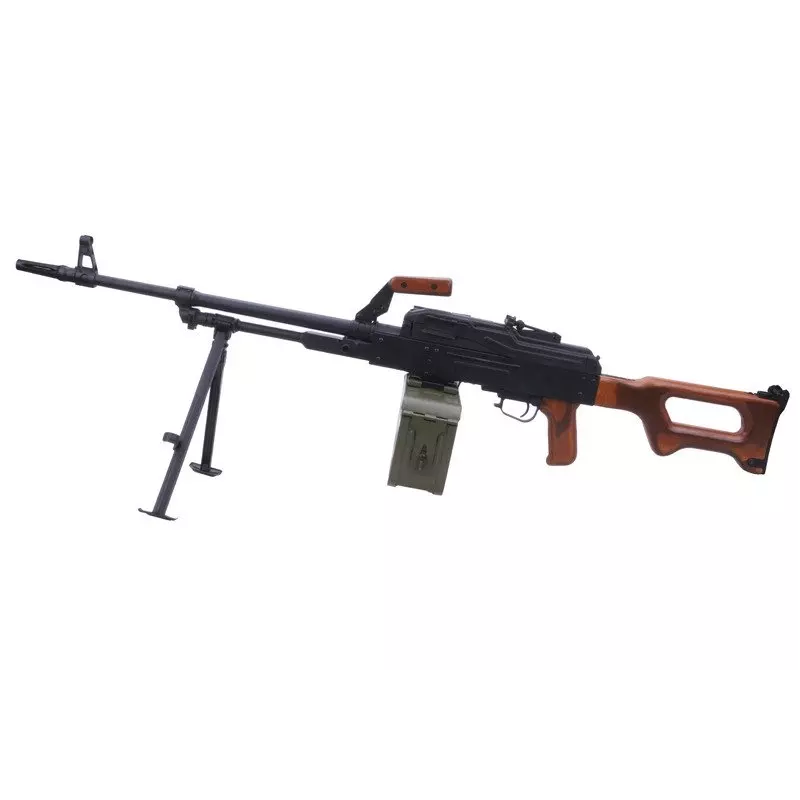 The A&K PKM is an electric airsoft gun (AEG) that delivers an authentic experience thanks to its realistic construction. It is made from a combination of metal, steel, and wood, faithfully replicating the appearance of the real machine gun. The body, top cover, bipod, carrying handle, and magazine are made of steel, while the stock and pistol grip are made of real wood. The machine gun is equipped with a foldable bipod for stable shooting and comes with a high-capacity electric magazine that holds up to 5000 BBs.