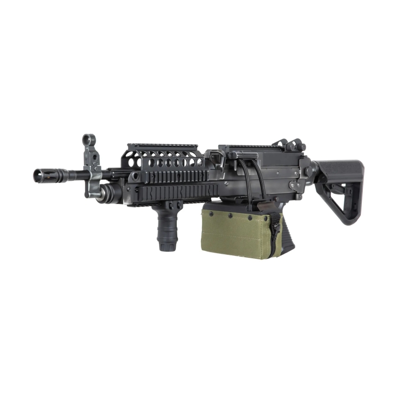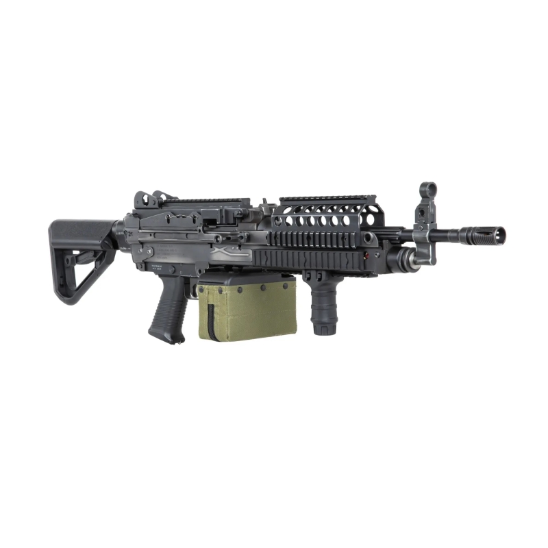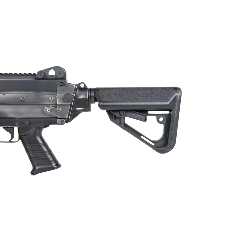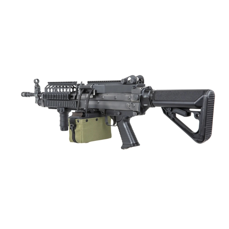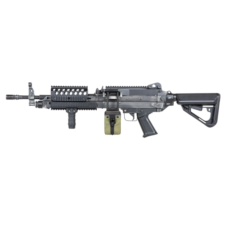 MK46 MOD 0 T8 SP Systems is a highly detailed replica of the FN Herstal MK46 (Minimi), produced in collaboration between A&K, CYBERGUN, and SP Systems. This licensed airsoft gun features authentic markings from the Belgian firearms manufacturer FN Herstal, offering players a realistic shooting experience. With its steel, aluminum, and polymer construction, it provides high durability and robustness while maintaining a reasonable weight of just over 5 kg. The A&K M249 series has been a staple in the airsoft world for some time, but the new T8 SP Systems version introduces a completely redesigned machine gun.