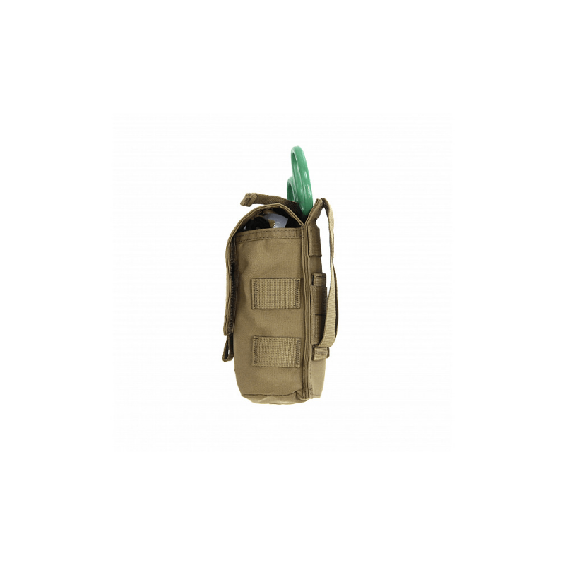 The rear features a dedicated holder for medical shears, accessible without opening the pouch. Side MOLLE loops allow for attaching extra gear like an additional tourniquet or pouch.