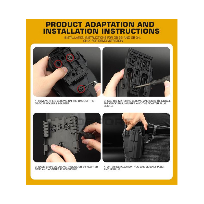 The package includes 6 screws for mounting both the holster and the base, making installation easy. The set consists of a plastic base that can be screwed onto belt, thigh, or MOLLE platforms, and a detachable QD mounting plate to which the holster is attached.
