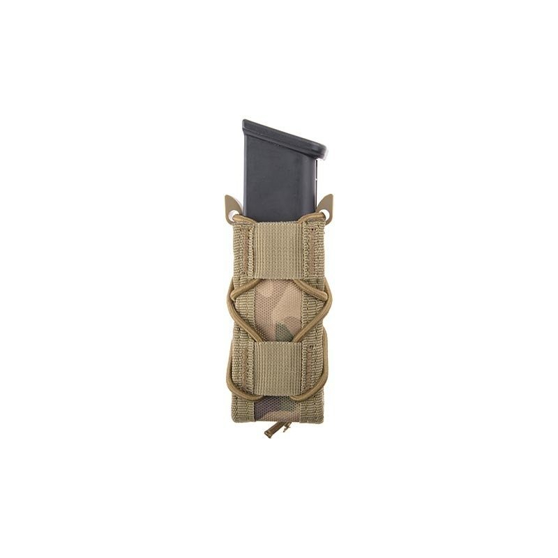 Attachable to equipment thanks to MOLLE system. The pouch does not have a traditional flap, which allows for a rapid access to the magazine itself. The magazine itself is secured in place with a rubber band as well as a special polymer safeguard, so the User does not have to worry about it accidentally falling out.