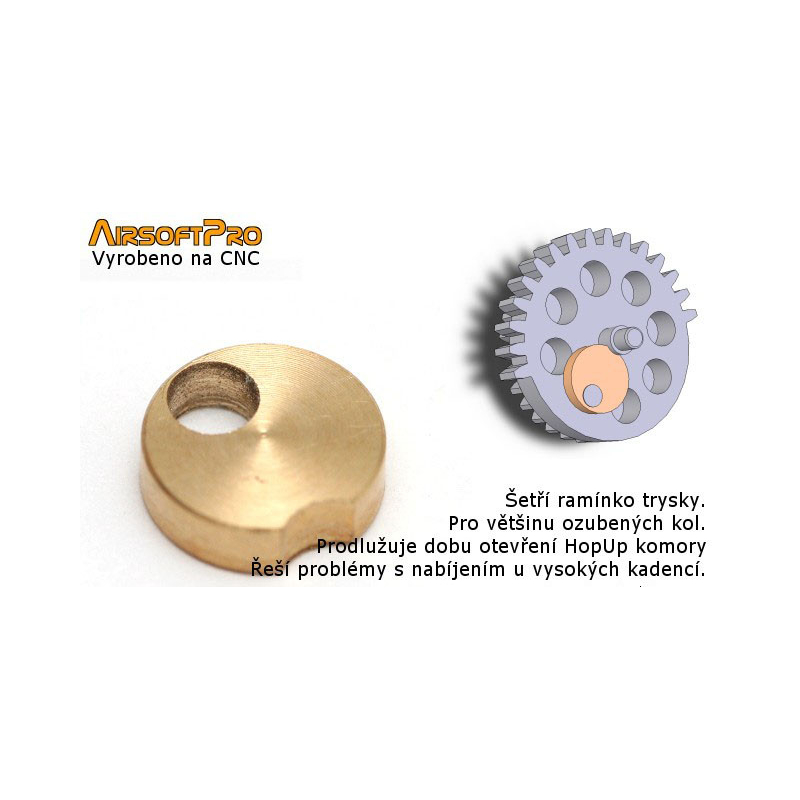 The purpose of the delayer is to keep HopUp chamber open for a longer time. It is mounted on the piston gear. It fit without gluing or fasten. Just press it between pin and axle. This small device could solve your problems with the bullets feeding. For exmaple on HROF guns. Before instalation remove brass ring, which is on the piston gear. If this ring is part of the axle, this cam cannot be used.