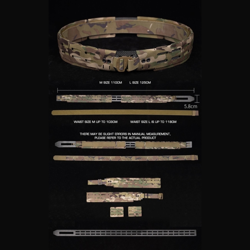 The second part is a premium outer belt made of a sturdy frame with MOLLE openings (58 mm wide), left and right MOLLE side panels made of low profile Cordura laser-cut (Laser-Cut) and 2 different buckles.