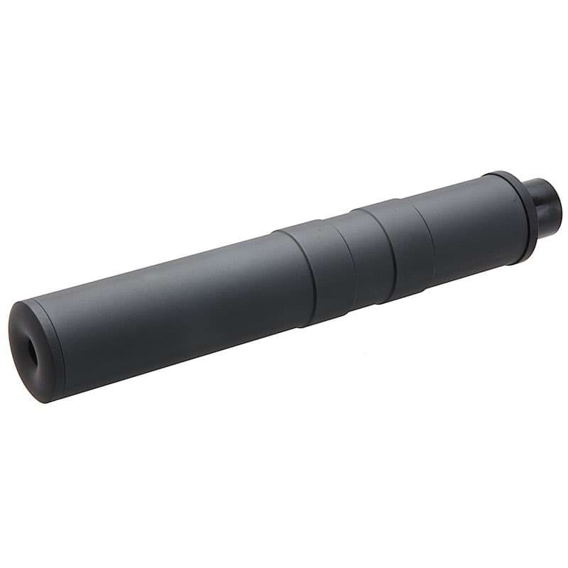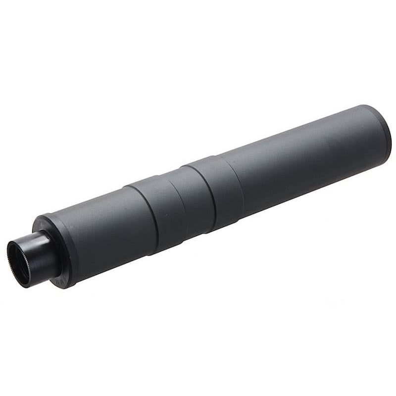 This suppressor is inspired by the real steel version and is truly robust! Thankfully, it's not as heavy. It is made from a combination of steel and aluminum. Additionally, with its length of 295 mm, it allows for the concealment of an extended inner barrel between 450mm and 467mm, which may slightly increase your FPS.