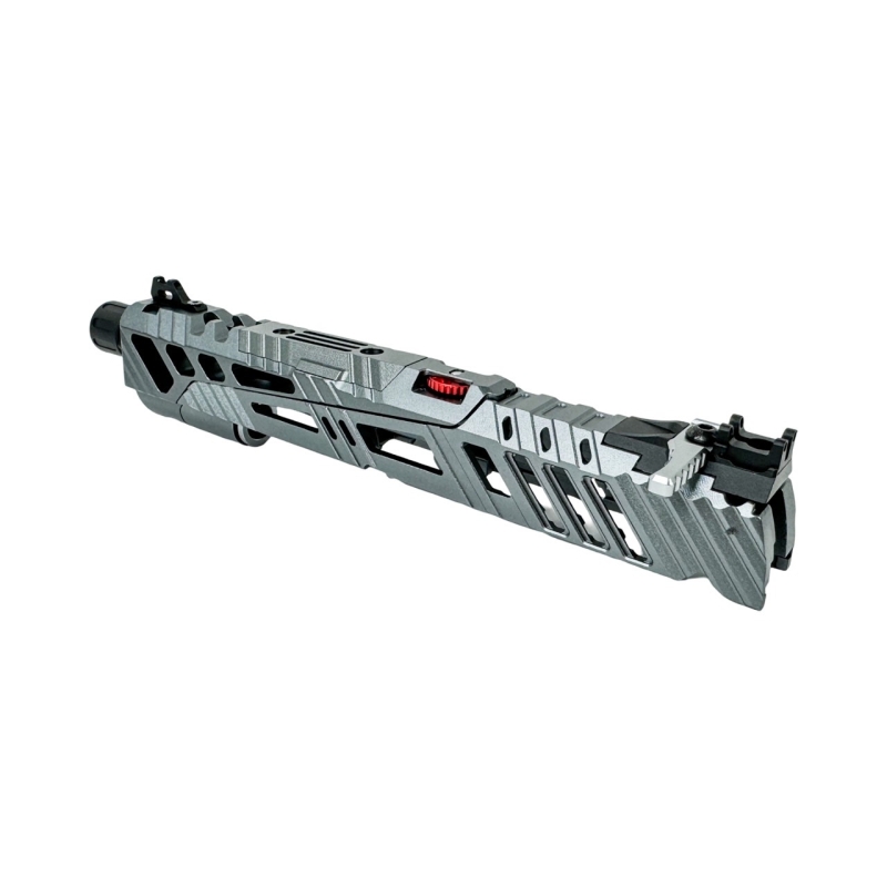 The slide is made from highly durable 6061 aluminum with precise CNC machining and features a split-slide design (only part of the slide moves) with a modification for a fixed outer barrel (non-recoil).