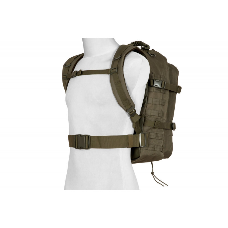 In the front, there is a pocket with a handy, small, mesh organizer, ideal for the carrying of a flashlight, a knife, a wallet, etc. The front, suspenders and sides of the backpack all feature MOLLE load-bearing system webbing, which enables the attachment of additional pockets and pouches. In addition, the implementation of elastic cords allows for the fastening of, for instance, a jacket. The top of the backpack features a transport handle, entire surface features D-rings and compression belts.