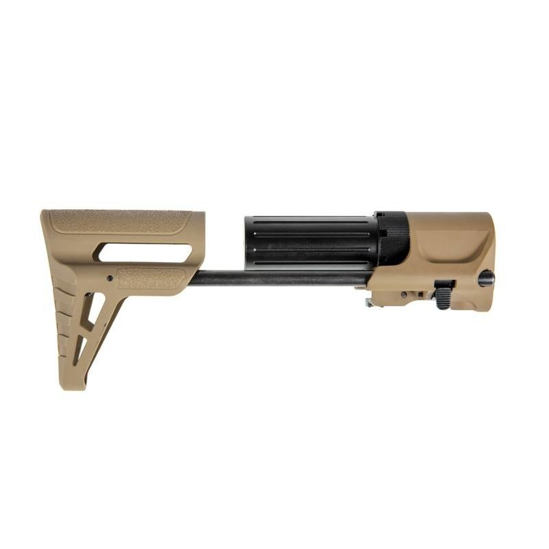 A compact, telescopic PDW stock for AR15 AEG carbine replicas. The stock pad was made of polymer covered with an anti-slip texture. Buffer tube rails are made of steel, remaining elements were made of a metal alloy.