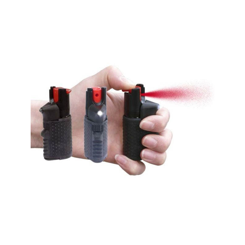 Replaceable 15 ml HURRICANE spray inside a rubberized grip with flashlight.