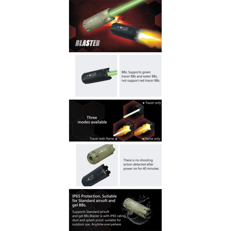 Do you want your airsoft gun to shoot with a realistic muzzle flash like a real firearm, so you can clearly track your hits in low light and CQB arenas? Or maybe you just want to fire like a Star Wars blaster? Then the AceTech BLASTER tracer suppressor is your dream come true. It combines BB tracer illumination with a realistic flame effect. Thanks to 3 powerful LED diodes at the muzzle, you’ll enjoy a flash effect with every shot. It shines brightest on gas guns, but also works great on AEGs. The suppressor is dust- and splash-resistant (IP65), making it ideal for outdoor games. The built-in Li-Ion battery powers up to 24,000 BBs, and after 5 minutes of inactivity it automatically switches to power-saving mode. Charging is via USB-C, and the suppressor is fully charged in 2.5 hours (USB-C cable included). The suppressor features a 14 mm CCW thread, and comes with an 11 mm CW adapter for pistols.