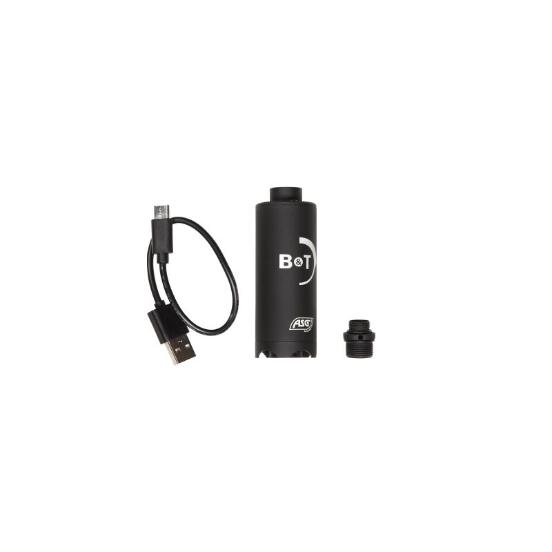 The suppressor includes a built-in rechargeable battery with USB charging and features an integrated motion sensor that conserves battery – it automatically turns off when idle. Thanks to its 14mm CCW thread and 11mm CW adapter, it is compatible with most airsoft guns, including pistols with internal threading.