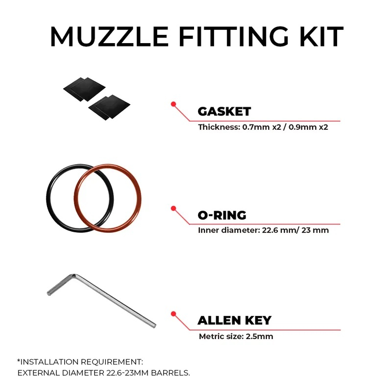 Thanks to 3 powerful LEDs mounted at the muzzle, you’ll enjoy a flame effect with every shot, especially effective on gas-powered shotguns. The suppressor is also dust and splash resistant (IP64), making it perfect for outdoor games. Its built-in Li-Ion battery provides illumination for up to 24,000 BBs, and after 5 minutes of inactivity, the device automatically enters sleep mode. Charging is handled via USB-C, with a full charge in 2.5 hours. This suppressor does not use a classic thread but instead a mounting sleeve for external shotgun barrels with a diameter of 23 – 23.5 mm (inner barrel approx. 22.6 – 23 mm).