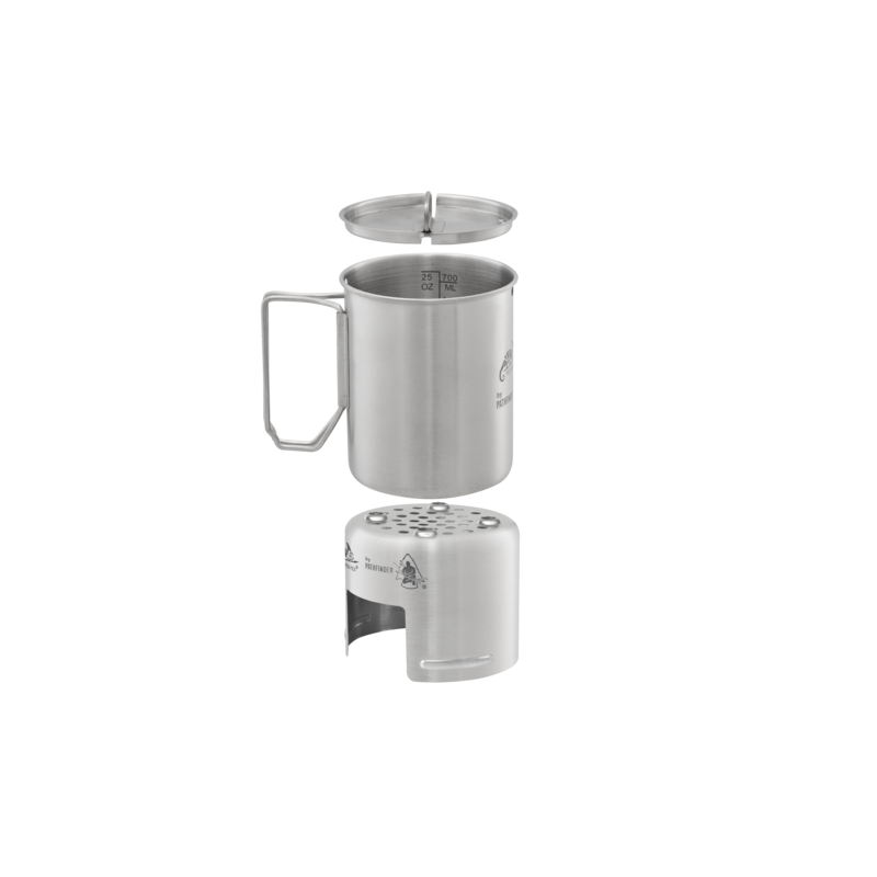 The PATHFINDER 32 oz (0,95 l) cooking set is an essential tool for any camping and outdoor enthusiast. The set includes a stove base, stainless steel bottle, and pot. Everything is designed to nest together, saving space in your backpack.