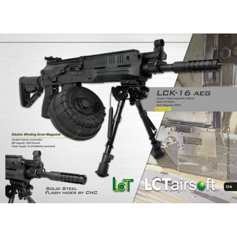LCK16 je replikou ruského pechotného guľometu RPK16. Zbraň má krásne oceľové telo, ktoré je zhodné s originálnou predlohou. Guľomet má polymérové pažbenie, ergonomickú rukoväť, posuvnú, modernú pažbu a vysokokapacitný, bubnový zásobník. Záver zbrane osadený RIS lištou, na osadenie taktického príslušenstva.