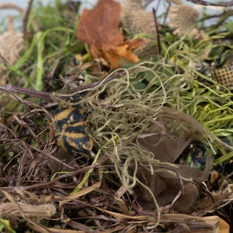 Chcete rozbiť siluetu svojej postavy? Hľadáte ľahkú a univerzálnu kamufláž, ktorú ľahko pridáte na hejkala (Ghillie suit), maskovací poťah alebo výstroj? Potrebujete materiál tenší než klasická raffia, ale stále dostatočne odolný? BURLAP CAMO set od Novritsch obsahuje syntetické jutové strapce v 3 prírodných farbách – piesková, khaki a tmavozelená. Ľahko sa naväzujú ako šnúrky a vďaka kombinácii farieb dokonale splývajú s prostredím. Set možno použiť samostatne alebo kombinovať s Novritsch Leaf Camo System, ANAREUS SilkLeaf či SilkGrass pre dokonalý maskovací efekt.