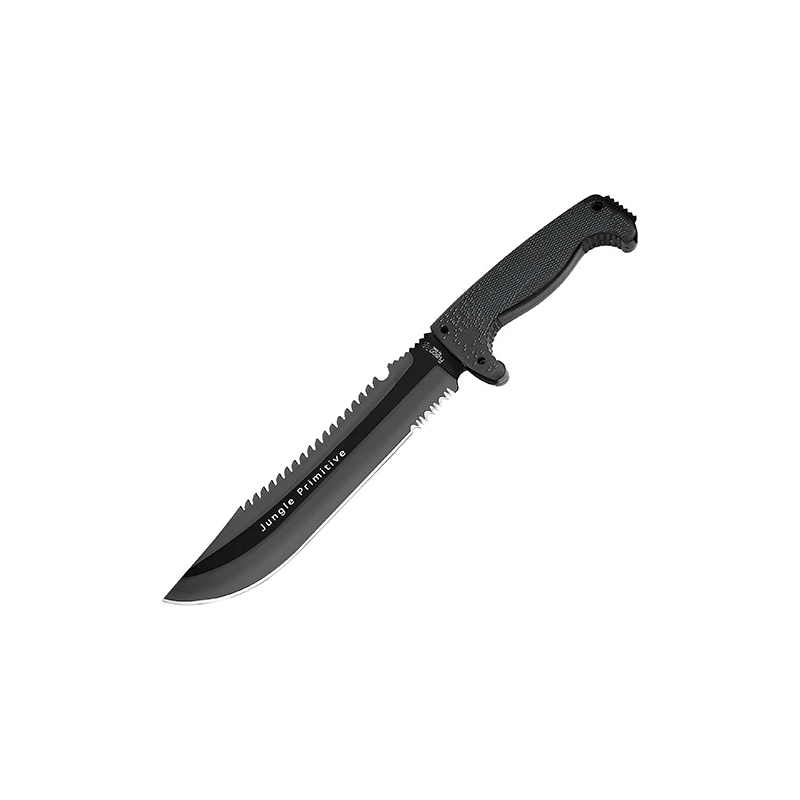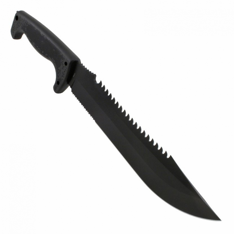 Velký nůž se skvěle hodí pro venkovní práce, jako je údržba cest a čištění křovin. 241 mm částečně vroubkovaná čepel z nerezové oceli s černým oxidovým povlakem, je na svém hřbetu opatřena pilovými zuby. Tvarovaná rukojeť z přilnavého materiálu Kraton zajistí, že mačeta bude v ruce držet jako přilepená. Konec rukojeti je vybaven ocelovým výběžkem, který se dá v případě nouze použít jako improvizované kladivo či probíječ skla.