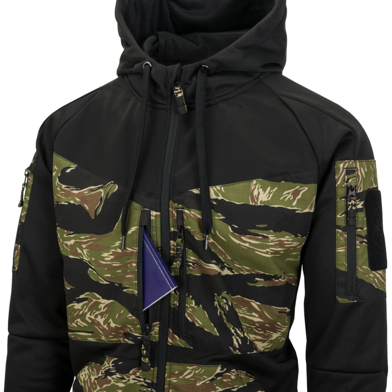 Na ramenách nájdete dve ďalšie vrecká, z vonkajšej strany vybavené VELCRO panelmi pre pripevnenie nášiviek. Rukávy sú zakončené elastickými nápletmi proti vyhrňovaniu. Kapucňa je nastaviteľná pomocou sťahovacích šnúr.