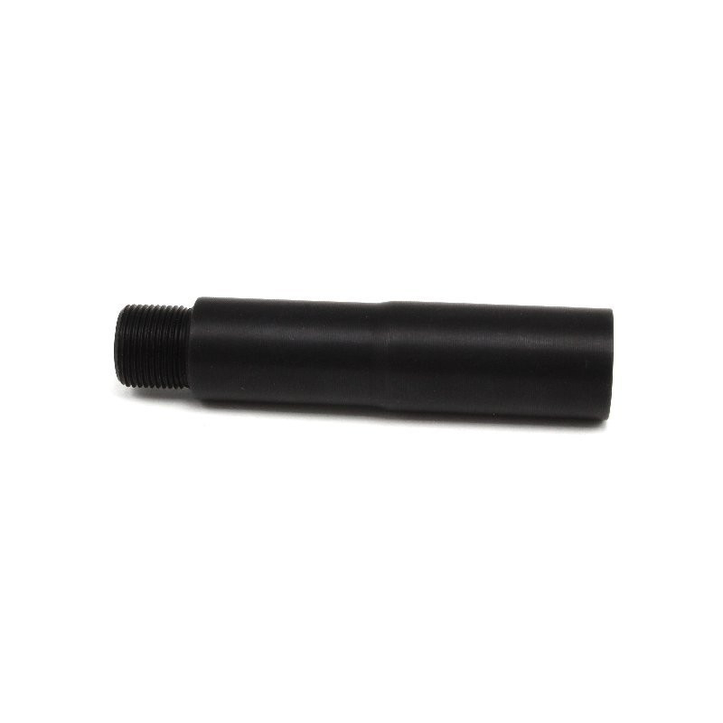 Kovový kus vnější hlavně pro elektrické zbraně. Délka 8 cm. Na jednom konci je vnitřní závit a na druhém vnější. Oba 14mm levotočivé. Na vnější závit lze namontovat běžné kompenzátory, nebo jiné tlumiče. Vzhledově určeno pro zbraně M4, ale hlaveň lze našroubovat i na většinu ostatních zbraní. Například G36, AK, P90, MP5, SCAR...atd. Celková délka prodlužovacího kusu včetně závitu je 8cm, přičemž prodlouží vaši vnější hlaveň o 6,8cm. Hlaveň je vyrobena na přesných CNC strojích v ČR z hliníkové slitiny. Povrch je tvrzen a černěn eloxováním