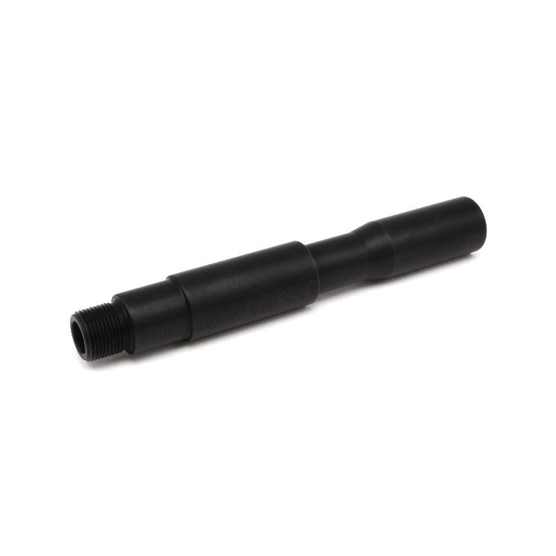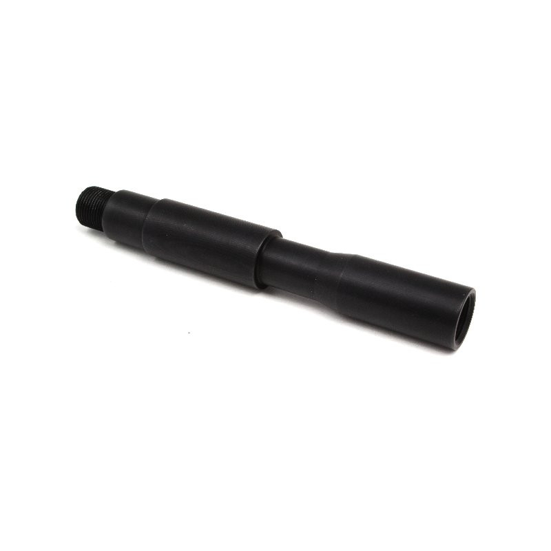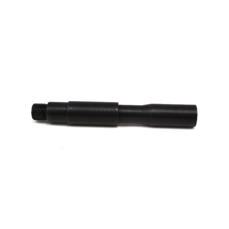 Kovový kus vnější hlavně pro elektrické zbraně. Délka 13 cm. Na jednom konci je vnitřní závit a na druhém vnější. Oba 14mm levotočivé. Na vnější závit lze namontovat běžné kompenzátory, nebo jiné tlumiče. Vzhledově určeno pro zbraně M4, ale hlaveň lze našroubovat i na většinu ostatních zbraní. Například G36, AK, P90, MP5, SCAR...atd. Celková délka prodlužovacího kusu včetně závitu je 13cm, přičemž prodlouží vaši vnější hlaveň o 11,8cm. Hlaveň je vyrobena na přesných CNC strojích v ČR z hliníkové slitiny. Povrch je tvrzen a černěn eloxováním.