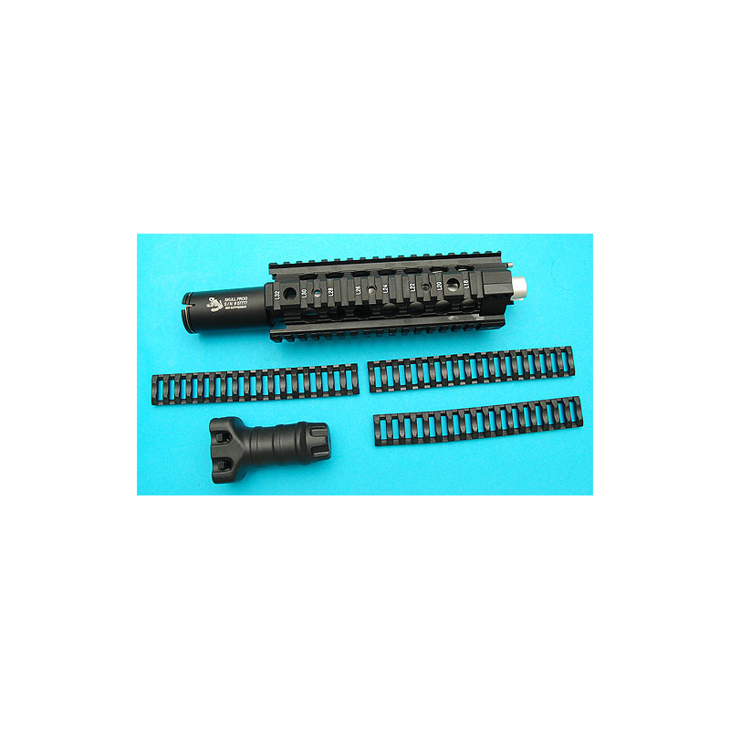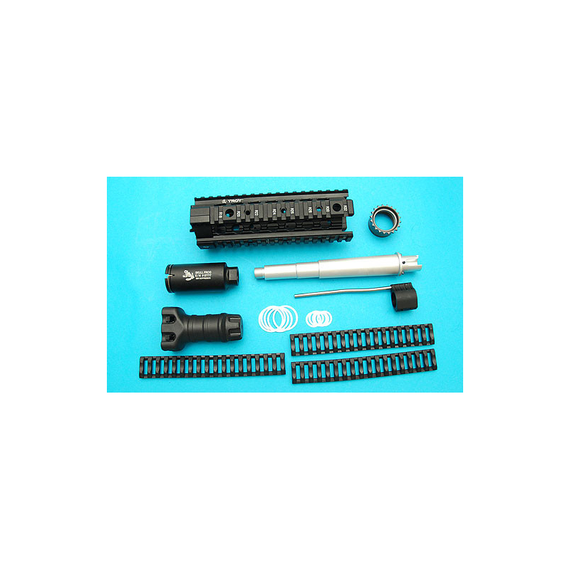 Set obsahuje hliníkové RIS předpažbí Troy, hliníkovou vnější hlaveň, tlumič výšlehu CQB, taktickou rukojeť Stubby a 3ks krytek RIS lišt.