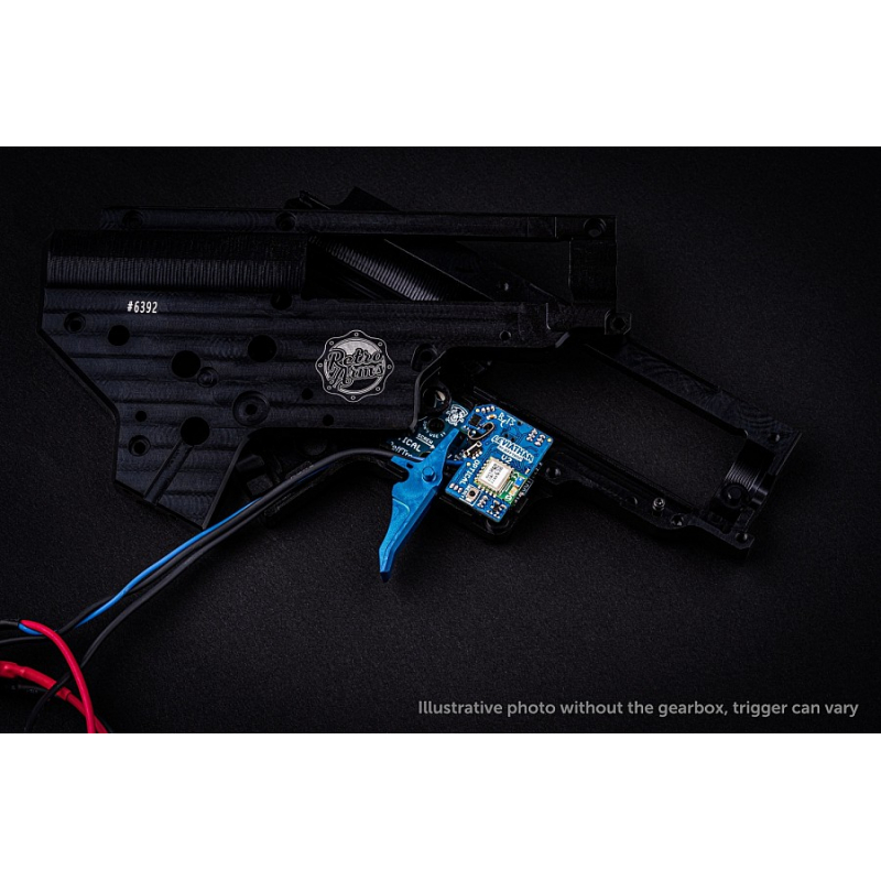 Leviathan V2 Optical je elektronická ETU jednotka s Bluetooth, určená na inštaláciu do mechaboxu V2 a V2.5 podľa TM štandardu. Vďaka optickým senzorom pre detekciu výstrelu a prepínača režimu streľby a extrémne krátkemu spínaču (iba 0,13 mm) umožňuje nastavenie realistického hair trigger módu. Systém Real Feel Trigger System (RFTS) so pružinou simuluje odpor reálnej spúšte a poskytuje reset po výstrele. Cez mobilnú aplikáciu JeffTron môžete v reálnom čase nastavovať režimy streľby, kadenciu, aktívnu brzdu, prednatiahnutie piestu, virtuálny zásobník a množstvo ďalších funkcií. Vstupný aj výstupný port podporuje pripojenie externých doplnkov ako svietidlá, elektrické zásobníky alebo senzor prázdneho zásobníka. Jednotka je chránená konformným lakom. Je kompatibilná s vysokokadečnými zostavami vrátane DSG kolies a je plne pripravená na Brushless motory ako Warhead. Všetky zmeny v aplikácii sa okamžite ukladajú do pamäte jednotky. K jednotke navyše dostanete aj CNC hliníkovú spúšť od Retro Arms s nastavovacím skrutkou a štýlovým dizajnom.