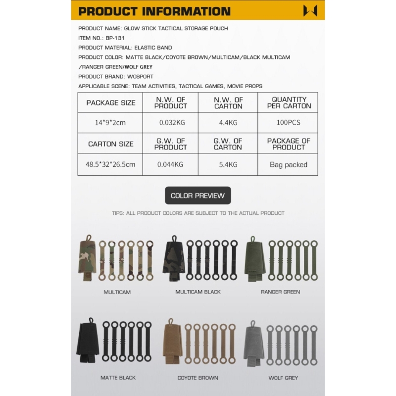 Elastická závesná sumka na lightsticky s rýchlovytahovákom od značky WoSport slúži ako držiak svetelné chemické tyčinky (lightstick). Vďaka elastickému materiálu sa do nej zmestí až 6 lightstickov. Na ne sa navlečie rýchlo-vytahovacie návlek (v balení celkom 3 rovné a 3 zúbkované rýchlovytahováky) a potom sa lightsticky umiestnia do sumky. Za ich horné očká sa prevlečie dodávané kovové lanko, ktoré ich ešte viac zafixuje. Pojistné lanko a smyčku sumky následne zavesíte na karabínu (nie je súčasťou) a tú umiestnite na výstroj.